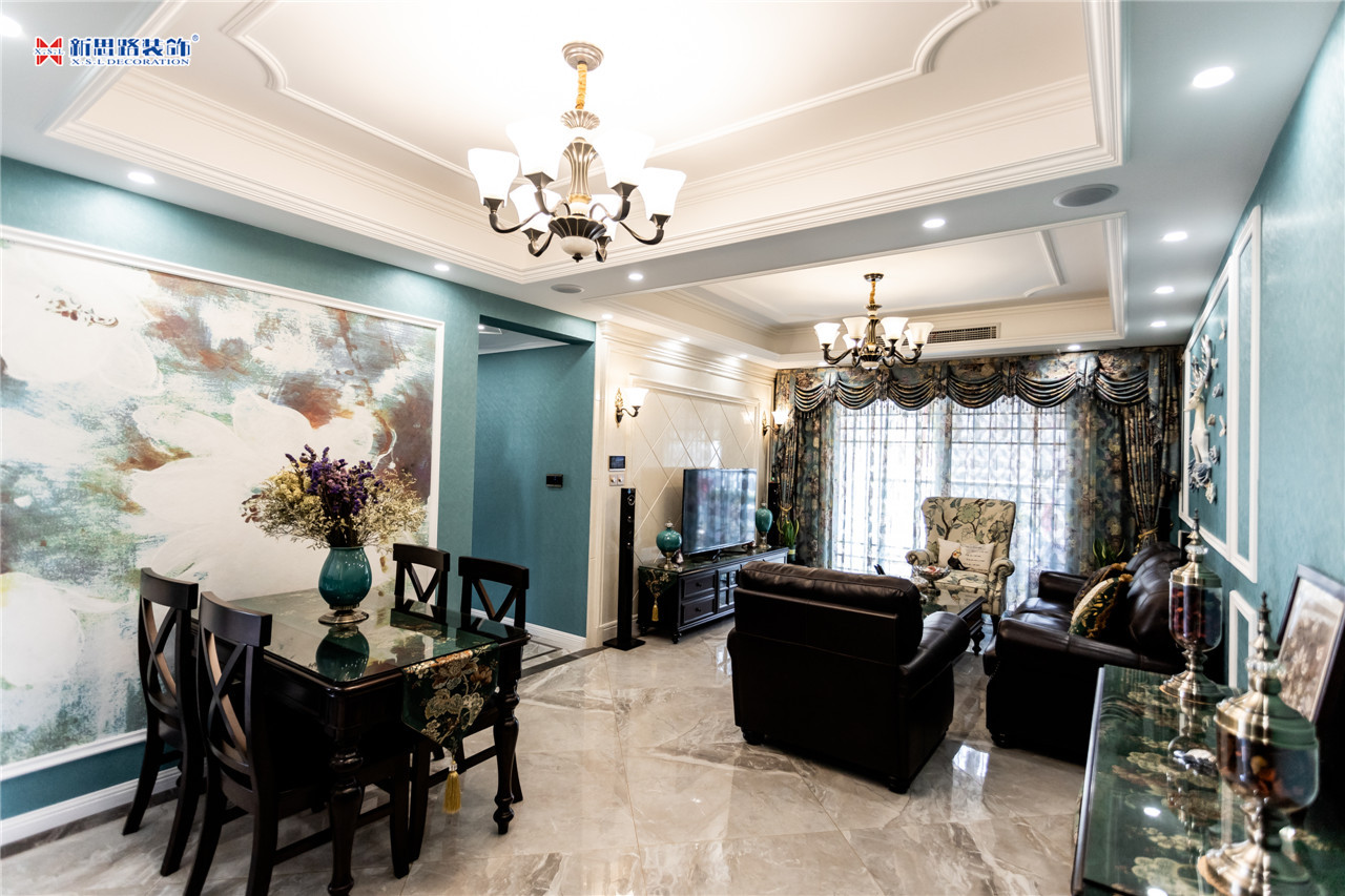沙發背景墻使用石膏線材勾畫幾何圖形,古典優雅;陶瓷的小鹿漫步花間,野趣橫生。復古花色的窗簾與真皮質地的沙發以及實木電視柜搭配起來正合適,線條分割成菱形網格狀的乳白色電視背景墻大方低調,黃銅色美式吊燈干凈明亮。深墨綠色的織錦桌旗無形中又添了點奢華意味,油青色的仿古裝飾擺件也是非常經典的美式元素體現。