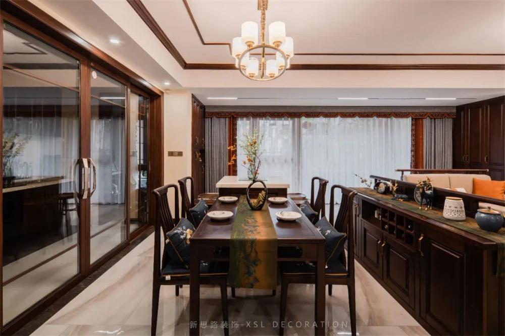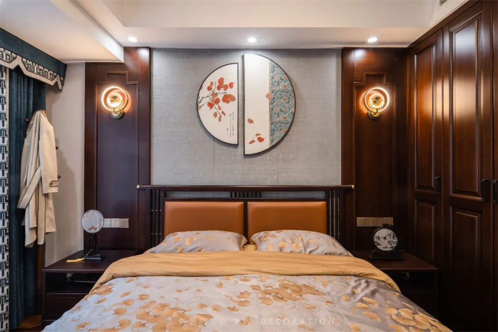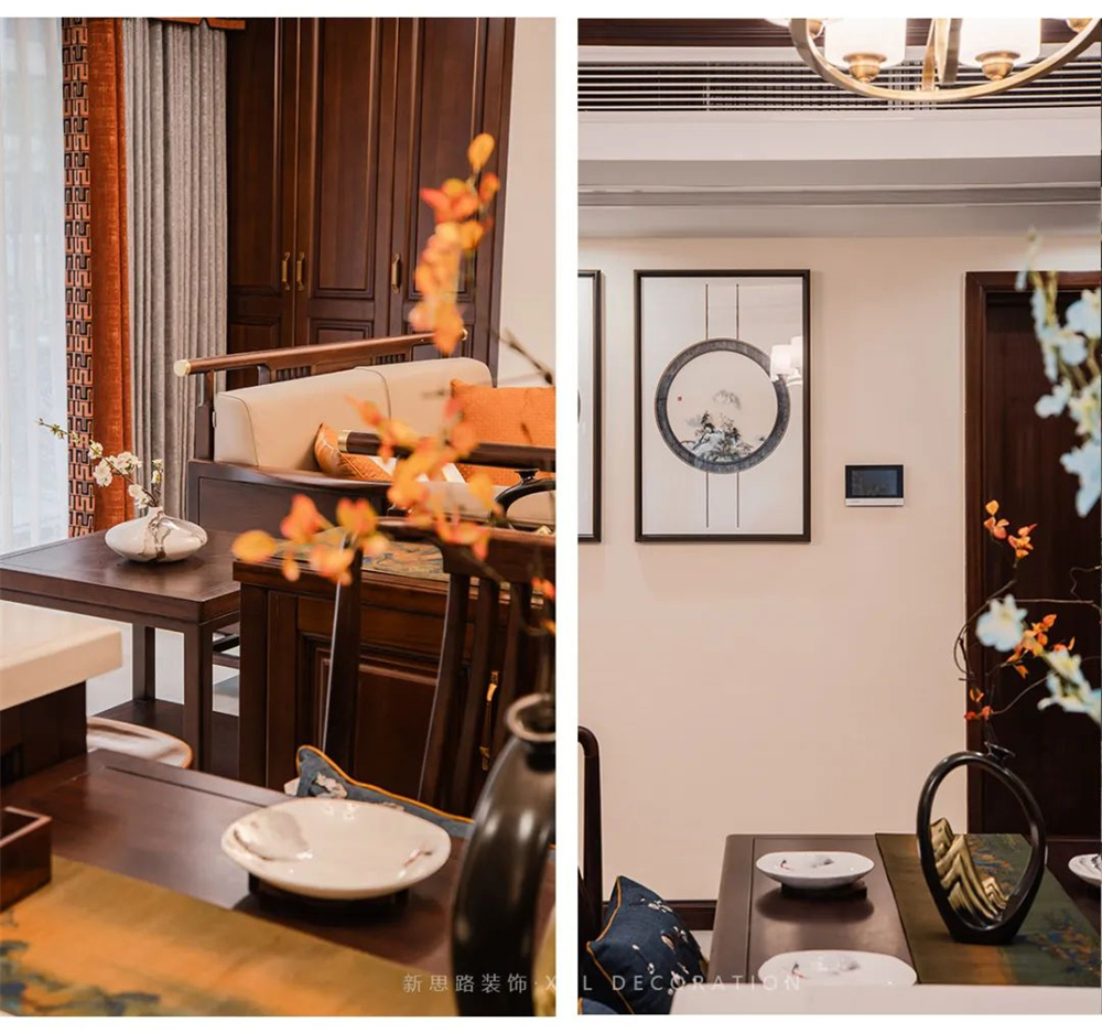 入戶玄關(guān)的視覺點(diǎn)用景和物做隔斷,半開半合中將視線引向內(nèi)部空間,餐廳使用木色與廚房空間氛圍為一體,餐桌上采用“清明上河圖”布飾加以山水瓶插花營造出大氣氛圍;暖色微醺的光源散漫折射照其上,撩撥平靜的心緒,蕩起一絲漣漪。明亮色彩的碰撞,傳遞中式意蘊(yùn)及趣味的同時,激活味蕾的感知;絲綢布藝與盤扣的細(xì)節(jié)點(diǎn)綴,調(diào)和深木色的沉悶印象,內(nèi)斂延綿。