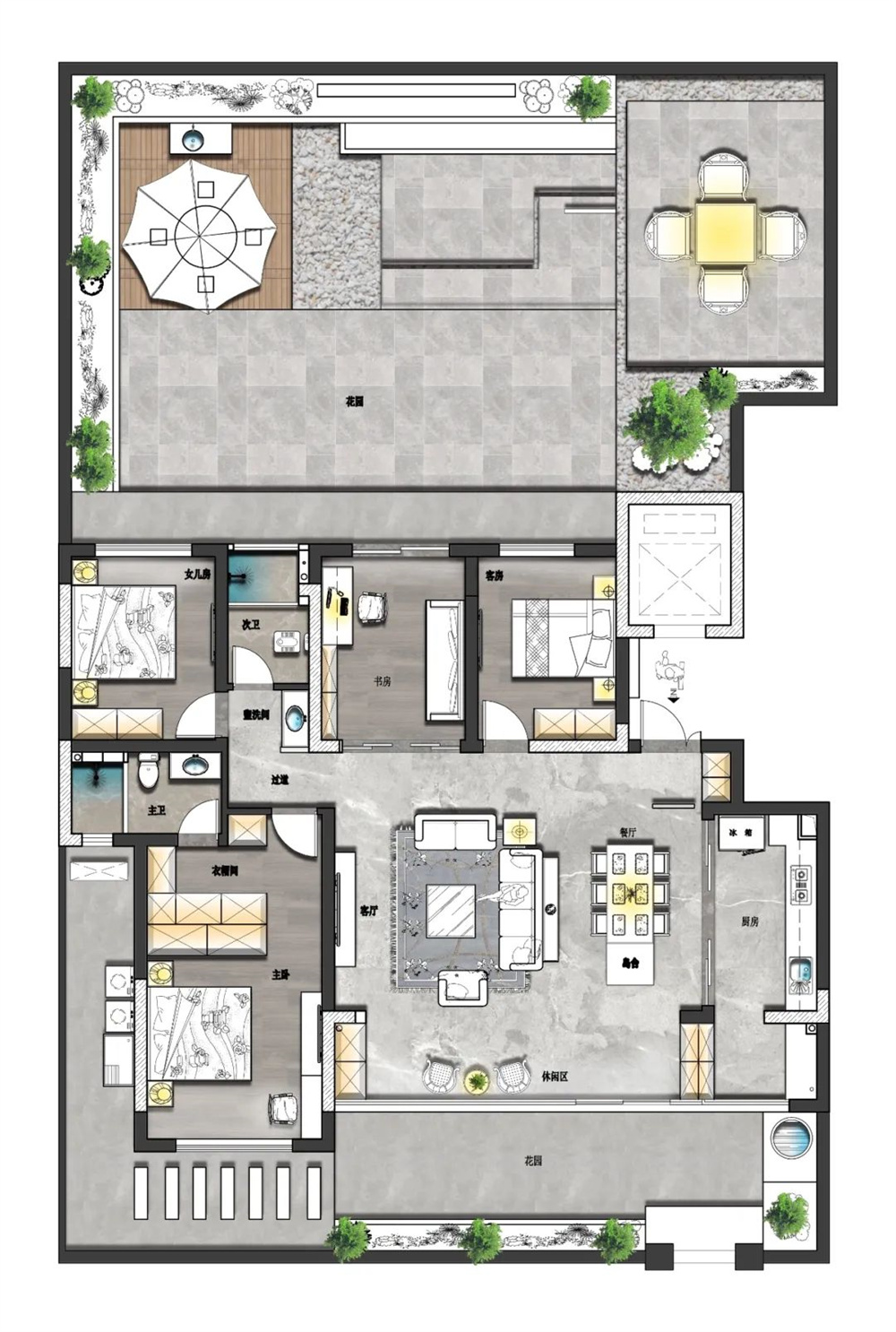 3、將臥室改為書房,書房到后花園打通做玻璃滑門,更方便;書房和客廳打通做鏤空隔斷,更通透。