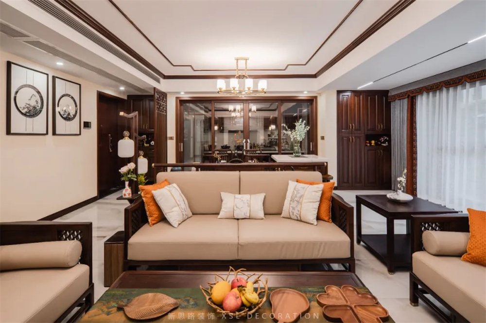 客廳空間衍脈自深厚邈遠(yuǎn)的傳統(tǒng)文化,從家具的形制、流線、色澤,到墨枝斜逸、山掩人家的山水掛畫,均鐫刻著東方詩性的肌理,流露出自信大方的悠悠風(fēng)骨。融合現(xiàn)代主義的簡約與傳統(tǒng)東方的形韻,令空間沾染著雅秀的氣質(zhì),清凈有格調(diào)。