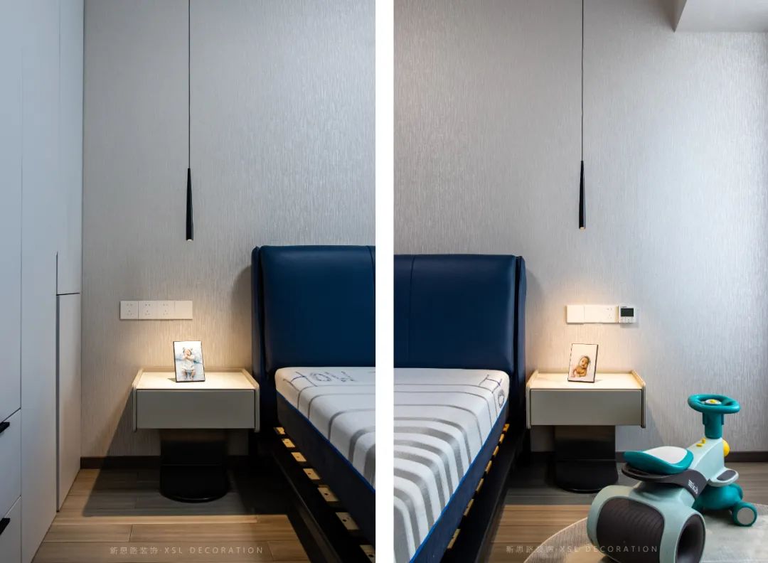 次臥作為青少年的睡眠空間,考慮到年齡的增長,所以延續(xù)簡約舒適的色調(diào)。深藍(lán)色床頭點(diǎn)綴形成設(shè)計美感,床頭柜與衣柜相結(jié)合增加層板的設(shè)計,可以滿足常用書籍或裝飾擺件的拿取,看似簡單卻使空間實(shí)現(xiàn)了的功能效。