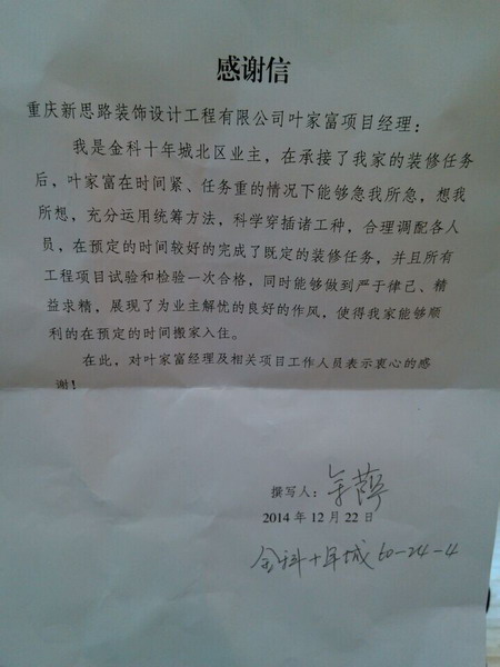 12月22日下午,新思路裝飾江北店收到了金科十年城業主余老師親自送來一封感謝信。信里洋溢著她對公司及葉家富工長的贊美和感謝之情,也讓我們感受到了來自冬日里的一抹溫暖和感動。