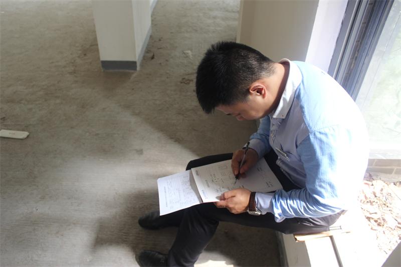 工程質檢正在認真填寫客戶服務手冊,以確認本次進場交底符合公司工程施工管理的相關規(guī)定。