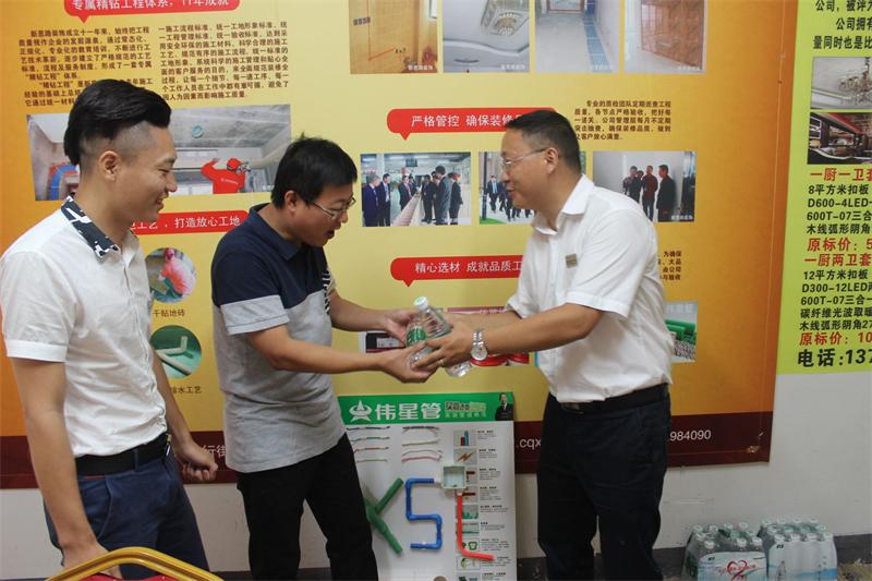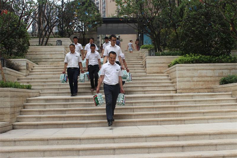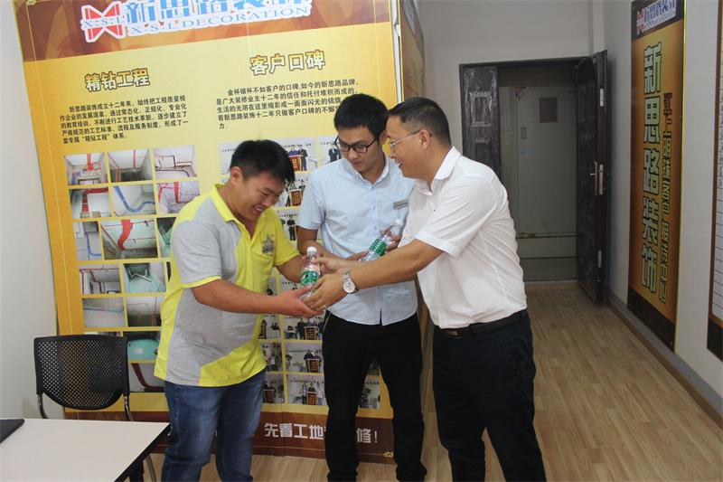 時下已是8月下旬,但山城氣溫依舊高居不下。炎炎夏日,驕陽似火,正是公司各施工工地趕工期、保品質的黃金時期。為了做好夏季防暑降溫工作,確保廣大一線員工的身心健康和安全,8月26日,新思路裝飾“2015夏季送清涼”活動正式啟動,以工程部、南坪店、北紅星店等部門組成的慰問小組,帶著藿香正氣水、礦泉水等防暑降溫物品,深入到工地施工一線,親切慰問在高溫下奮戰的工人師傅們,給他們送去了公司的關懷和絲絲清涼。
