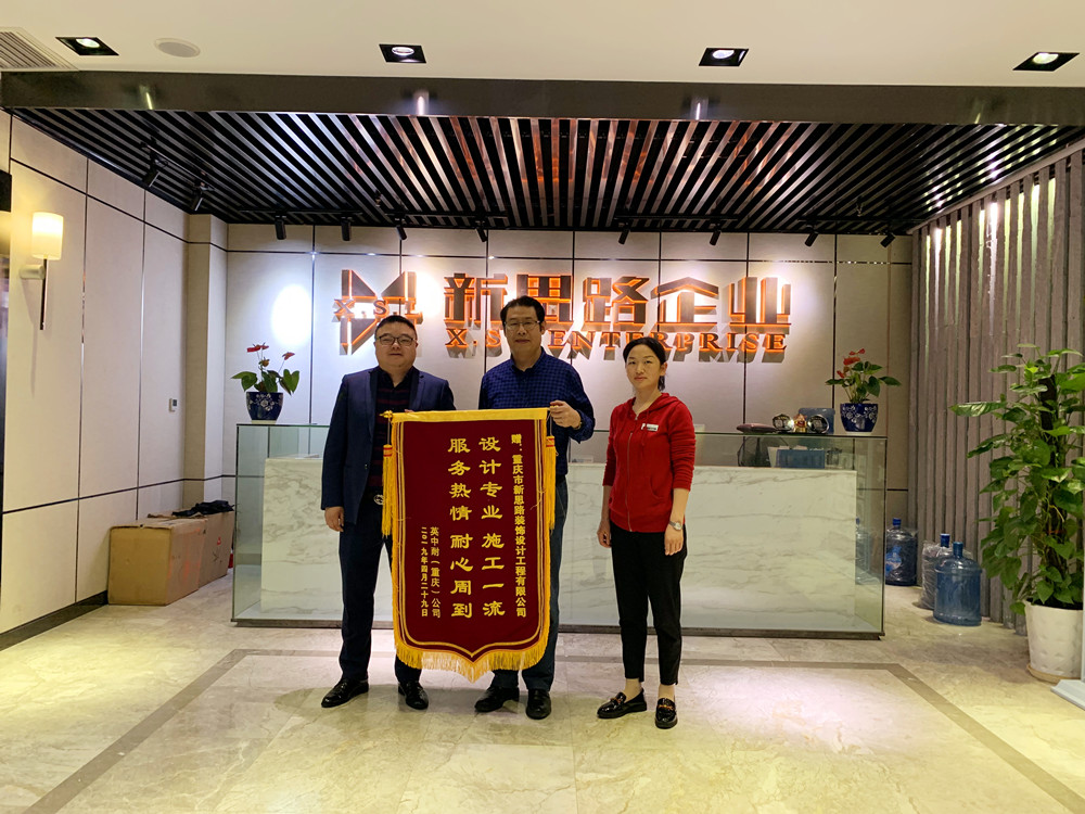 5月4日上午,公裝項目英中耐(重慶)公司段總,為新思路送上一面大紅錦旗。“設計專業、施工一流;服務熱情、耐心周到”這16個字充分體現出對我們新思路裝飾公裝部的設計、施工及服務的高度認可。