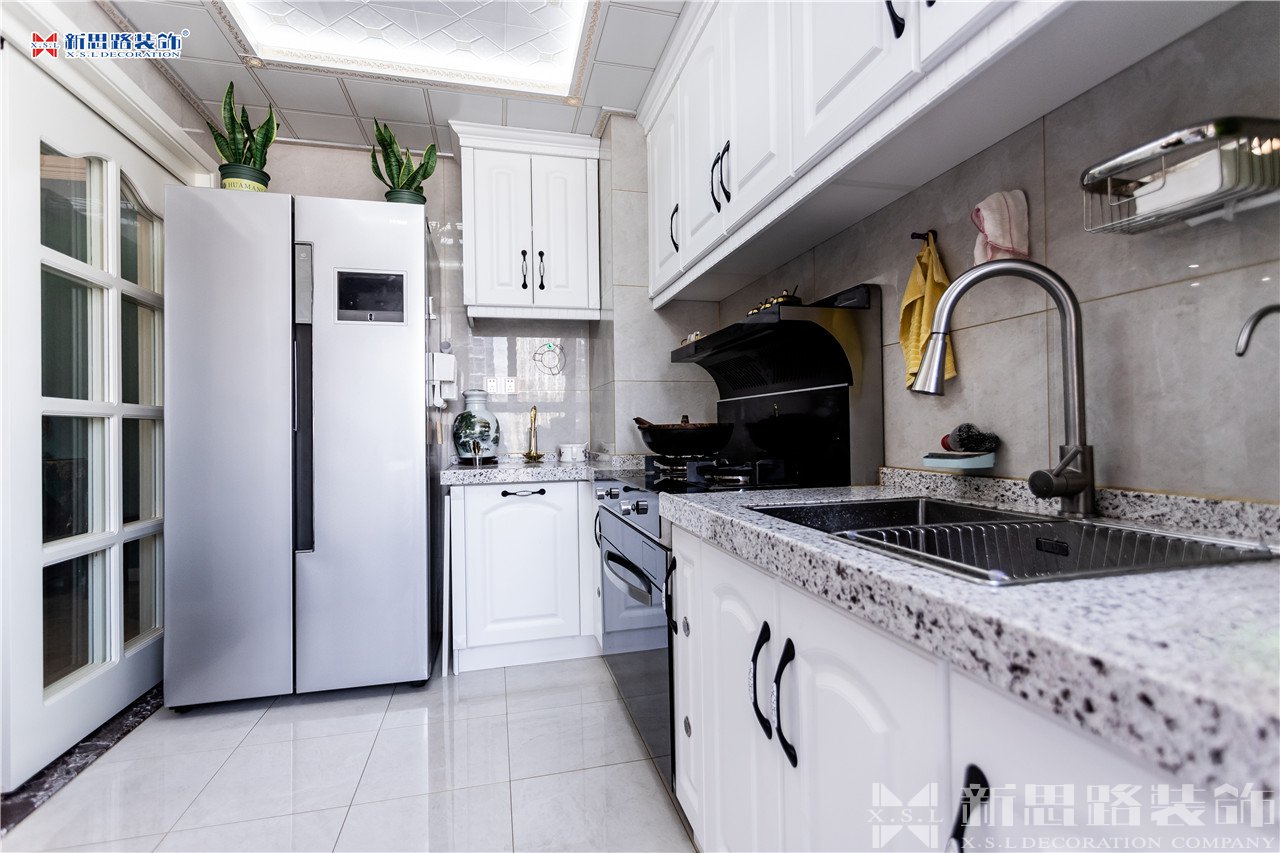 廚房灶臺(tái)使用白色大理石材質(zhì)打造,料理臺(tái)的設(shè)計(jì)更方便食物的制作。櫥柜顏色也選取了同色系的白色,清新干凈,讓本是油煙滿滿的廚房視覺上看起來明亮整潔。