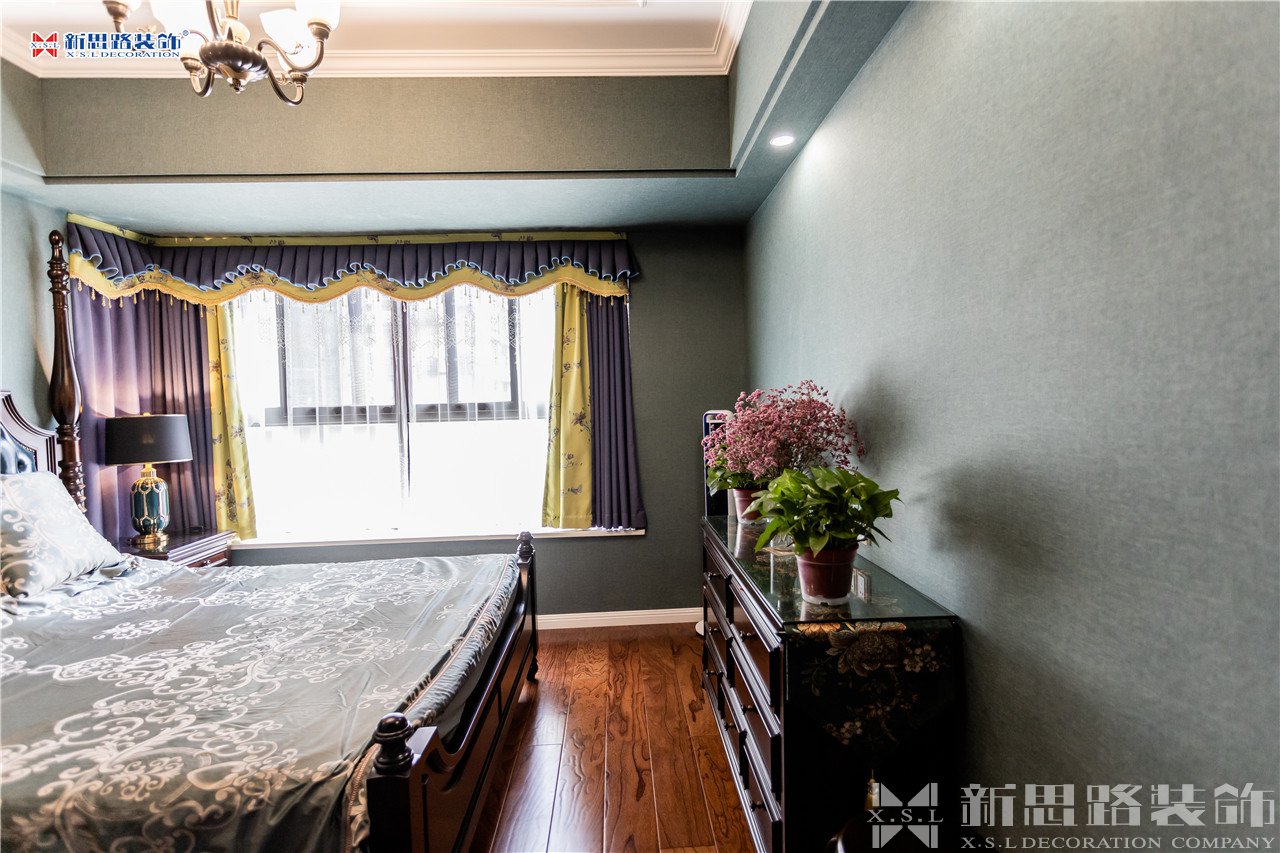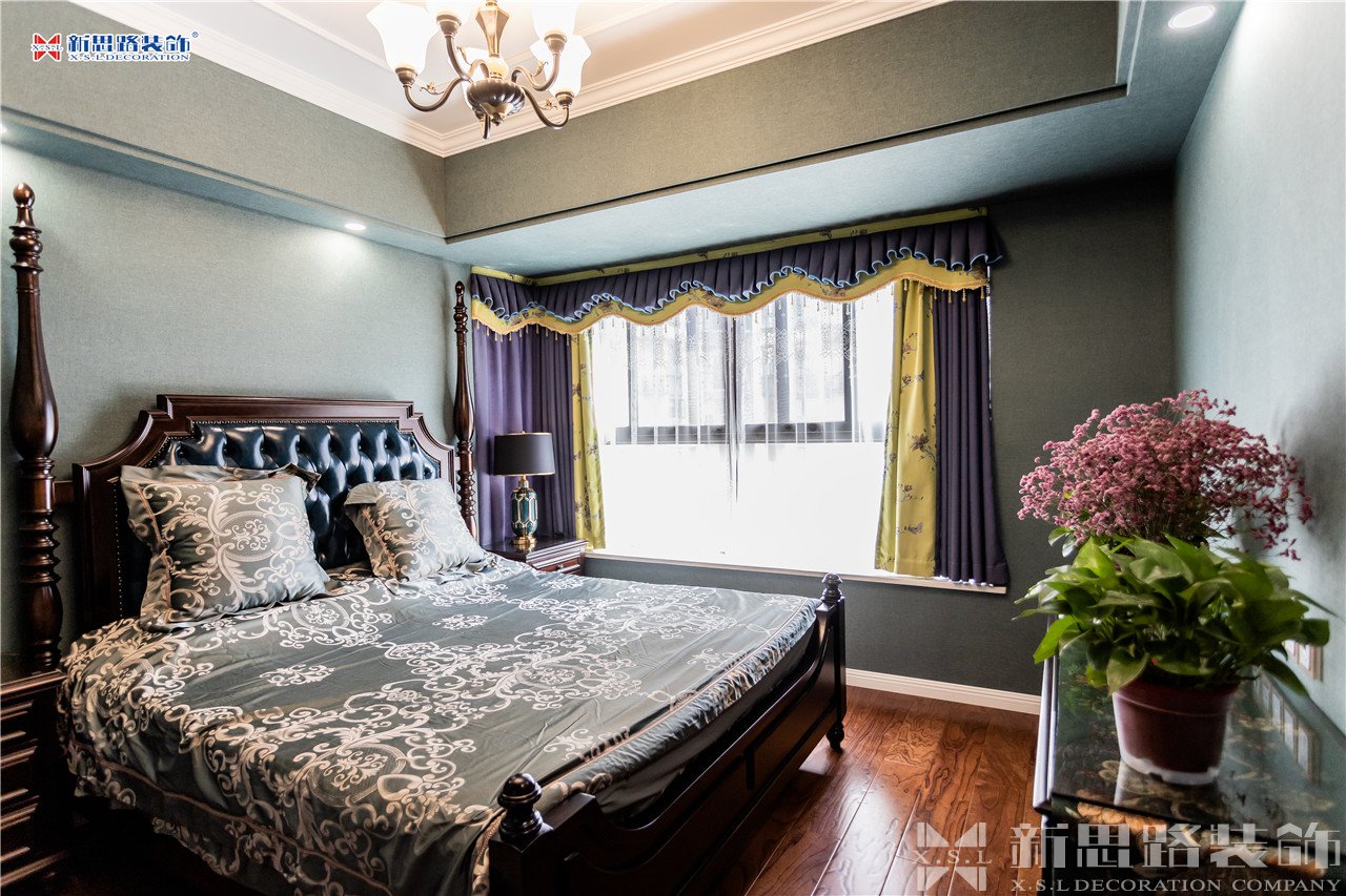 沙發(fā)背景墻使用石膏線材勾畫幾何圖形,古典優(yōu)雅;陶瓷的小鹿漫步花間,野趣橫生。復(fù)古花色的窗簾與真皮質(zhì)地的沙發(fā)以及實(shí)木電視柜搭配起來正合適,線條分割成菱形網(wǎng)格狀的乳白色電視背景墻大方低調(diào),黃銅色美式吊燈干凈明亮。深墨綠色的織錦桌旗無形中又添了點(diǎn)奢華意味,油青色的仿古裝飾擺件也是非常經(jīng)典的美式元素體現(xiàn)。