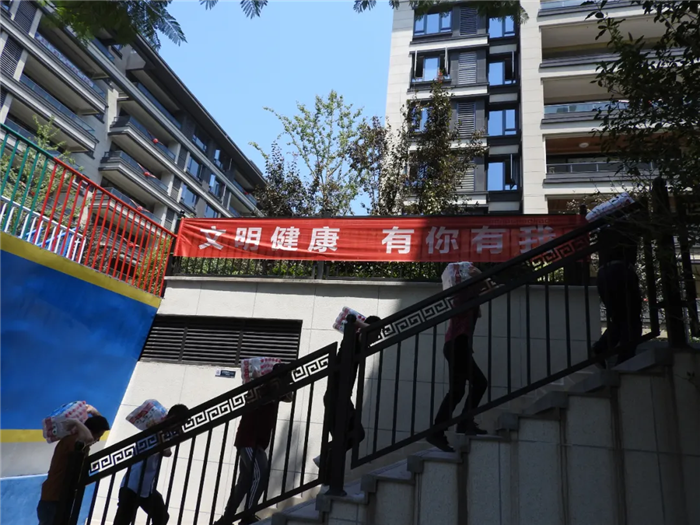 林肯公園小區,張總正在帶領慰問小組搬運礦泉水