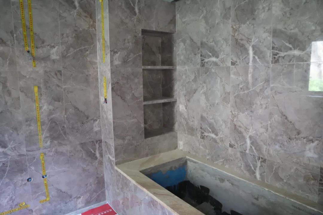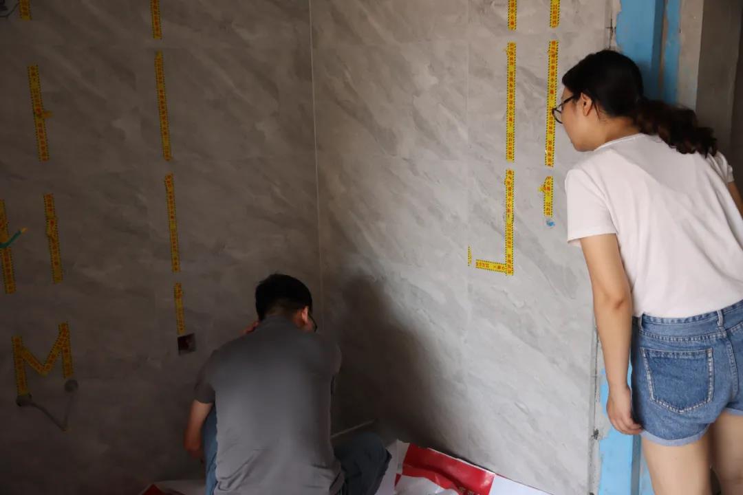 衛(wèi)生間瓷磚拼貼完成后,接下來就要準(zhǔn)備上馬桶、臺盆、柜子等的安裝。衛(wèi)生間空間有限,各個物品的尺寸需要復(fù)核多遍,保證最后在安裝的時候能夠正好符合。為此,設(shè)計師敖元壩和業(yè)主再次對衛(wèi)生間的一些尺寸進(jìn)行了測量。
