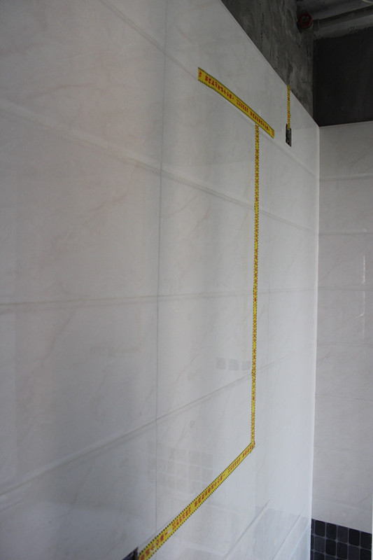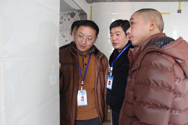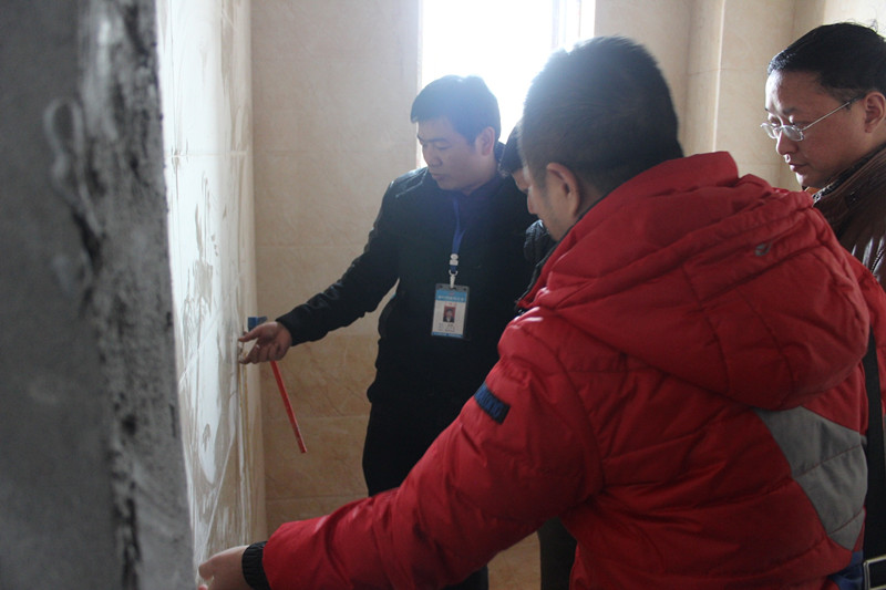 巡查小組在認真探討墻面貼磚工藝細節